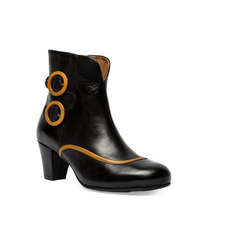 Precioso botín retro con punta de almendra y tacón cónico de 6 cm para que no tengas que renunciar a tu estilo ni en los meses más fríos. Hechos una suave piel color negrocon un ribete mostaza resiguiendo el empeine. Dos hebillas decorativos redondas de color mostaza en la parte exterior. Cierre lateral interno con cremallera negra. Interior completamente forrado en piel marrón transpirable, con la planta totalmente acolchada para un mayor confort. Cuenta con suela de goma y refuerzos en la puntera y el talón para evitar deformaciones.