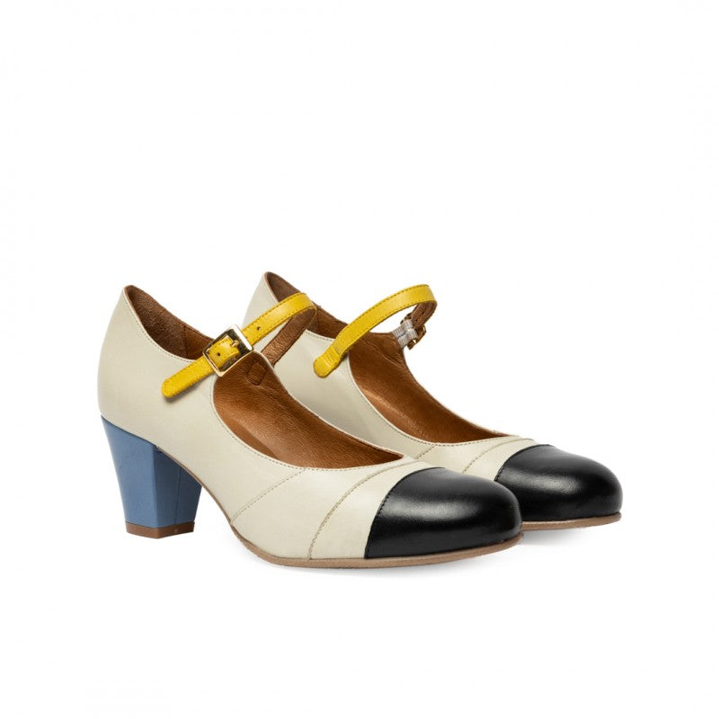 Linda amarillo, negro y azul es nuestro zapato tipo Merceditas en piel para mujer con suela de goma. Esta versión mezcla tres colores vibrantes y contrastantes: amarillo, negro y azul, creando una propuesta original pero muy combinable. Su tacón bajo de 5 cm, tipo cono, aporta comodidad y elegancia, convirtiéndolo en un básico moderno y versátil.