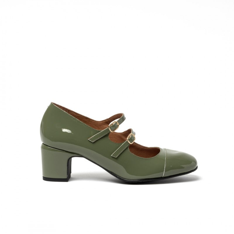 Zapatos tipo Mary Jeen en charol verde, con puntera redondeada y tacón de 5cm, perfectos para el día a día. Interior completamente forrado en piel marrón transpirable, con la planta totalmente acolchada para un mayor confort. Cuenta con suela de goma y refuerzos en la puntera y el talón para evitar deformaciones.