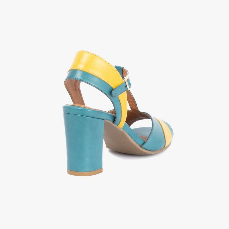 Nuestras sandalias de tacón Candy, en original combinación de colores turquesa y amarillo, son la pieza diferenciada en nuestro estilo. Elegantes peep toe, con tira central y cierre con hebilla dorada, son el complemento perfecto para esas ocasiones especiales. Hechos a mano con gran detalle en cortes de piel sueve. Tienen suela antideslizante y plantilla acolchada para mayor confort. Interior completamente forrado en piel marrón transpirable. Colección Primavera-Verano 2020
